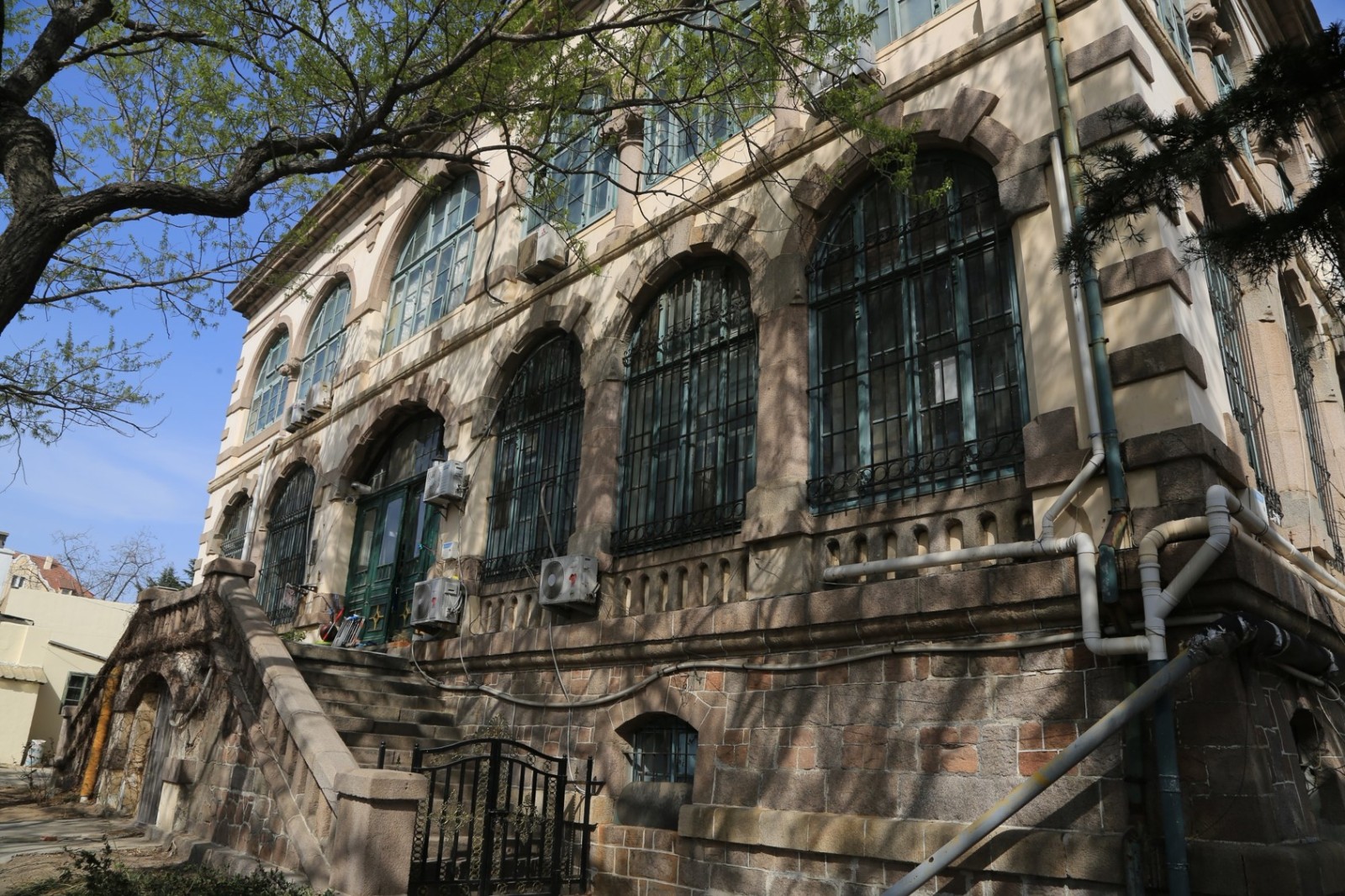 德華銀行舊址,位于市南區(qū)廣西路14號(hào)。德國建筑師海因里?!ゅa樂巴和路易斯·魏爾勒設(shè)計(jì)。采用19世紀(jì)意大利文藝復(fù)興式建筑風(fēng)格,德國三段式建筑,磚木結(jié)構(gòu)。占地約8307平方米,建筑面積562平方米。青島歷史上第一家銀行建筑,磚木結(jié)構(gòu)。地上二層并設(shè)有半地下室,屋頂為青黑色,留有很小圓形老虎窗的蒙莎頂,西面和南面設(shè)兩層通風(fēng)的券柱式外廊。高約4米。外墻為多孔式沙漿抹面,建筑四角鑲有隅石。