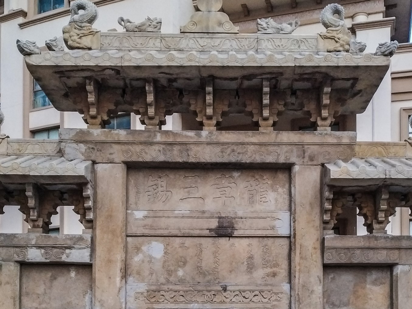 大棗園牌坊為一處兩座,間距為60米。形制及大小基本相同,皆為四柱三間,全石雕筑。頂部牌樓為斗拱承檐之仿木構(gòu)型,精雕細(xì)刻,氣勢(shì)不凡。東牌坊坊額兩面均橫刻“龍章三錫”四個(gè)楷書大字,下一層橫額豎刻王柱今的履歷;西牌坊坊額兩面均橫刻“義方式訓(xùn)”四個(gè)楷書大字,下一層橫額上豎刻王柱今的三個(gè)兒子和孫子王懿科舉應(yīng)考的名次。大棗園牌坊,是目前青島地區(qū)唯一幸存的一處功德石牌坊。