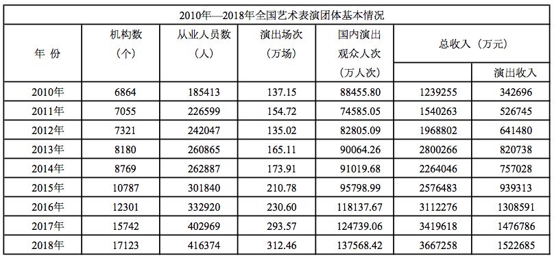 年末全國共有藝術(shù)表演團(tuán)體17123個,比上年末增加1381個,從業(yè)人員41.64萬人,比上年末增加1.34萬人。其中各級文化和旅游部門所屬的藝術(shù)表演團(tuán)體2078個,占12.1%,從業(yè)人員11.44萬人,占27.5%。
