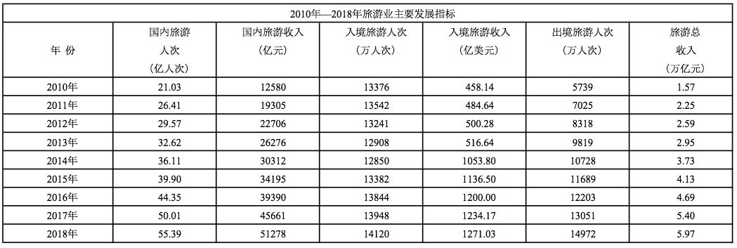 2018年國內(nèi)旅游市場持續(xù)平穩(wěn)增長,入境旅游市場穩(wěn)步進(jìn)入緩慢回升通道,出境旅游市場快速發(fā)展。全年國內(nèi)旅游人數(shù)55.39億人次,比上年同期增長10.8%;入境旅游人數(shù)14120萬人次,比上年同期增長1.2%;出境旅游人數(shù)14972萬人次,比上年同期增長14.7%;全年實現(xiàn)旅游總收入5.97萬億元,同比增長10.5%。